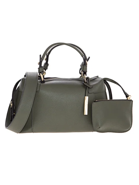 Детали: прямоугольная объемная форма, зернистая искусственная кожа, две ручки, широкий плечевой ремень, дополнительный небольшой кошелек, фирменная подвеска, молния на три стороны. Внутри прорезиненое покрытие.