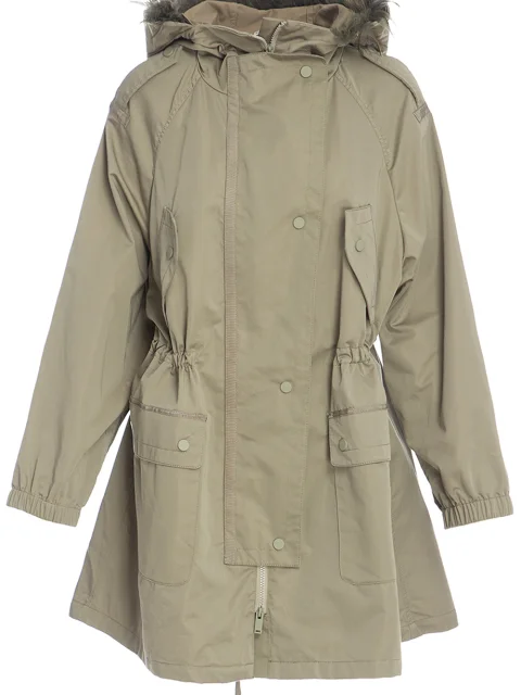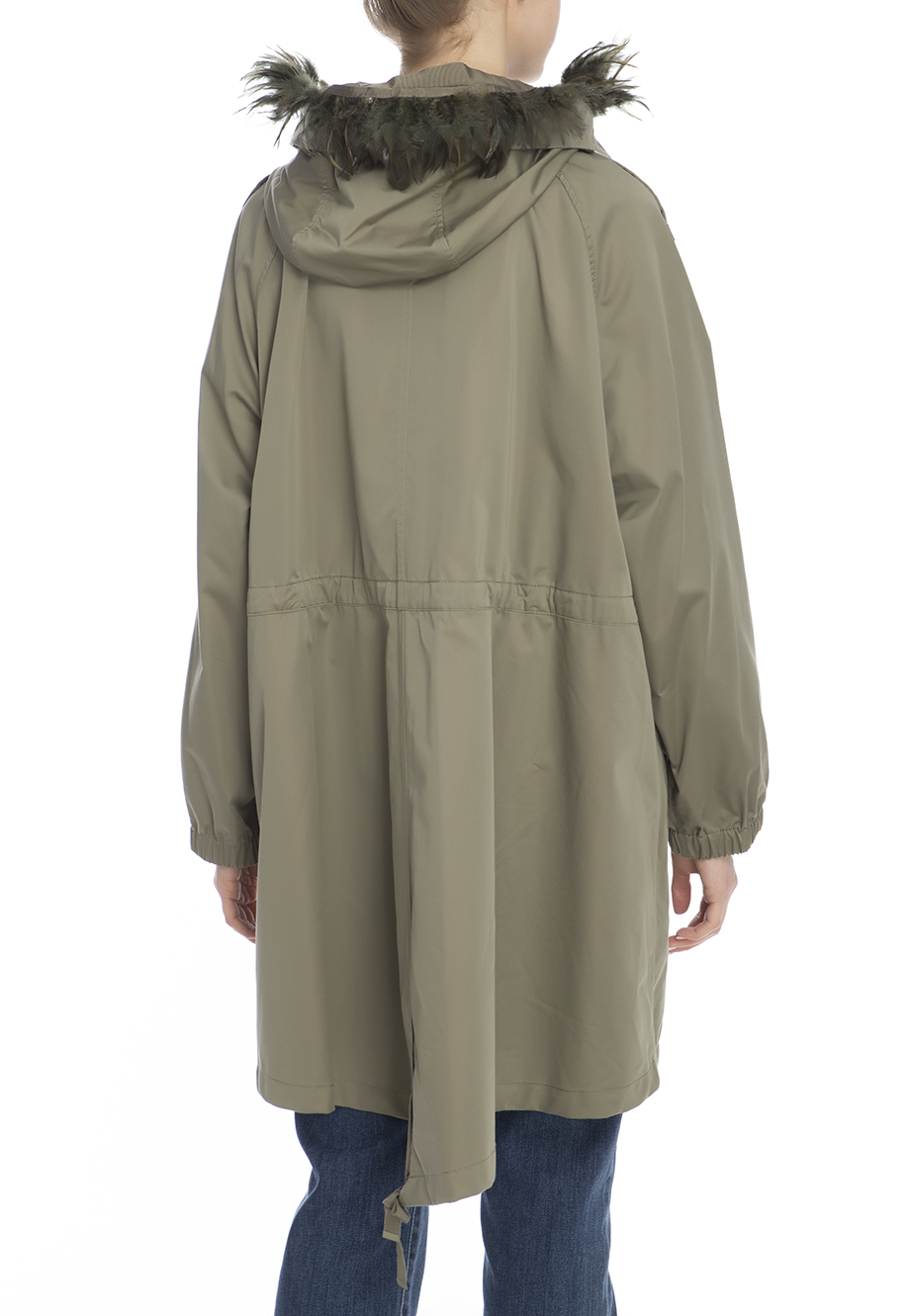 Детали: прямой крой, ворот с капюшоном, съёмная опушка из перьев, длинный рукав реглан с резинкой по кромке, погоны на плечевых швах, два нагрудных кармана с клапаном, два накладных по бокам, кулиска по линии талии, удлиненная спинка с разрезом. Застёгивается молнией и клапаном на кнопках.