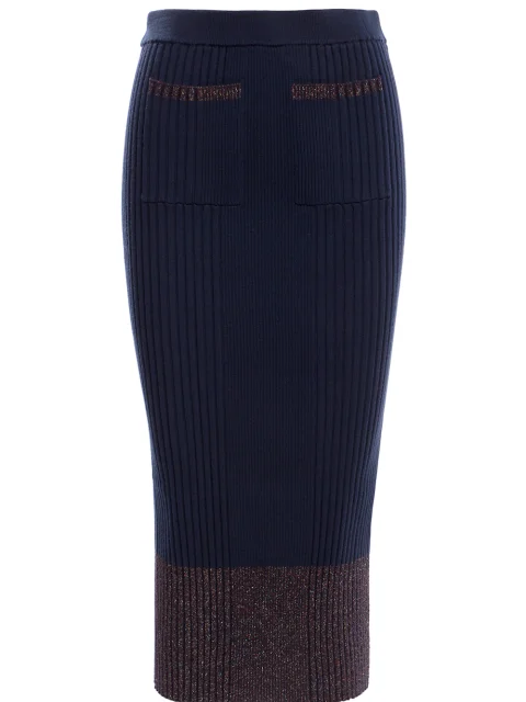 Детали: прямой крой, высокая посадка, эластичный пояс, два накладных кармана спереди, вставки люрекса по подолу и на карманах.