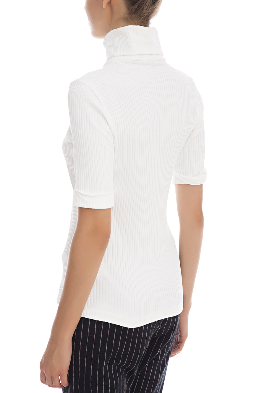 Детали: облегающий крой, высокий ворот с отворотом, короткий втачной рукав с отворотом, фактура вязки в рубчик.