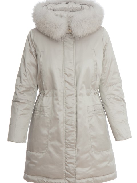 Детали: прямой крой, ворот стойка, отстегивающийся капюшон с меховой опушкой, кулиска по линии талии, карманы-листочки по бокам и на груди, длинный втачной рукав. Застегивается молнией с двумя бегунками и клапаном на кнопках. Утеплитель пух/перо (90/10%).