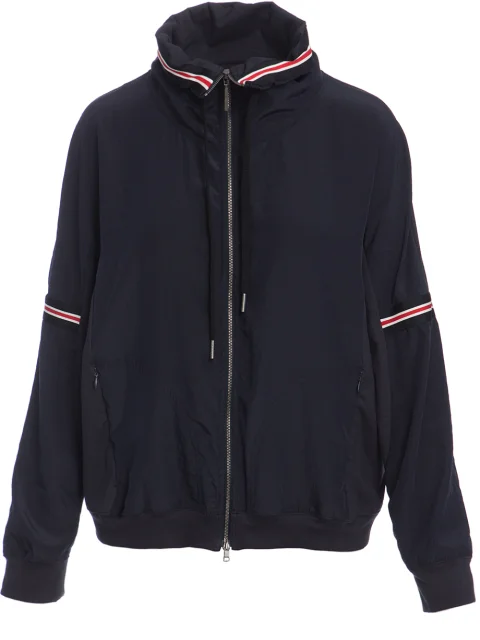 Детали: овальный крой, высокий ворот с затяжным шнурком, спущенный длинный рукав с полосатыми нашивками и манжетами. Прорезные карманы с молниями по бокам, резинка по нижнему краю. Застёгивается молнией с двумя бегунками.