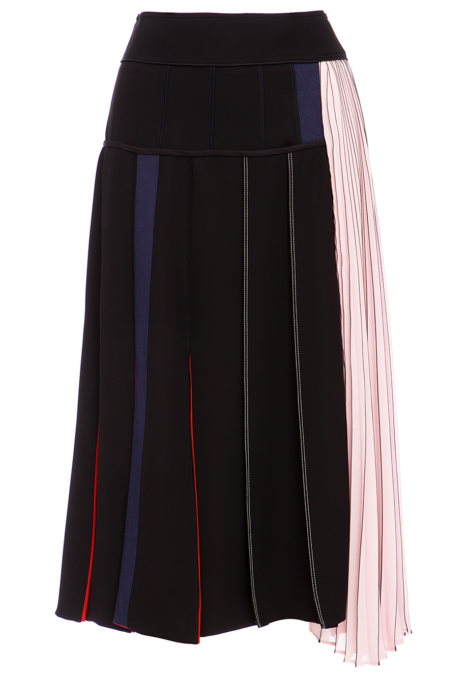 Детали: А-силуэт, высокая посадка, комбинированные материалы, плиссировка и крупные складки.