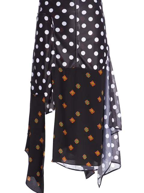 Детали: А-силуэт, высокая посадка, асимметричный крой, комбинация материалов с разным принтом.