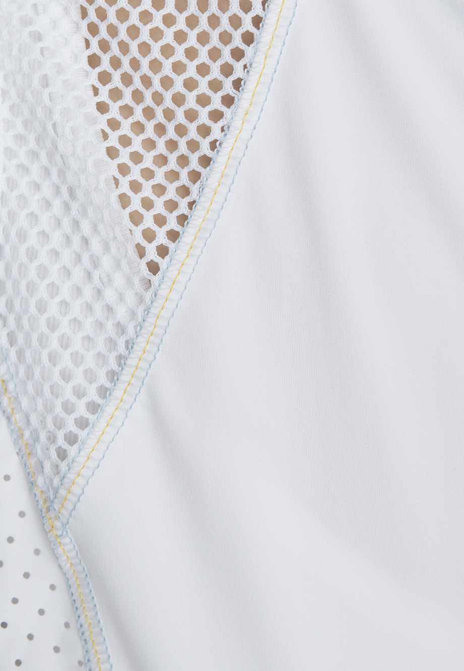 Детали: А-силуэт, круглый вырез горловины с планкой и молнией, отрезная линия талии, вставки из мембранной сетки, длина выше колена.
