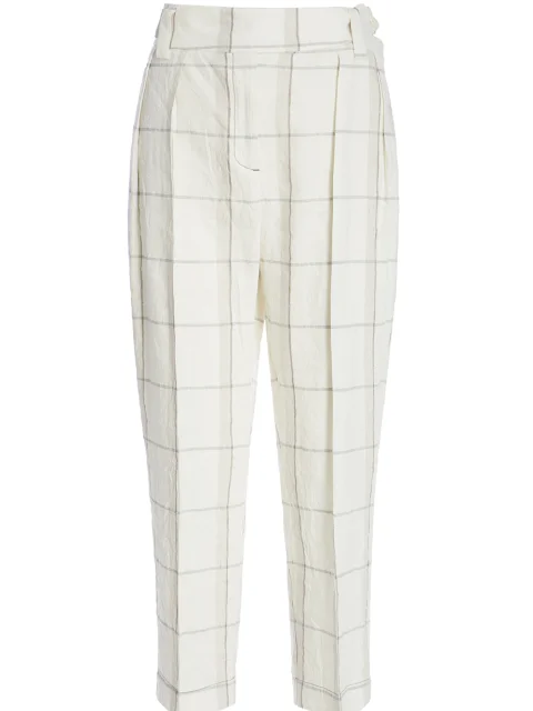 Детали: традиционный крой, слегка зауженный книзу, высокая посадка, прорезные карманы по боковым швам, сзади прорезной карман с рантом, стрелки вдоль штанин, пояс, клетка.