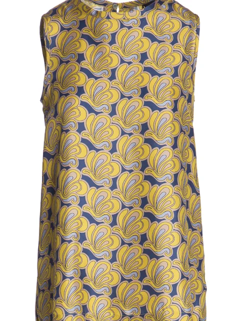 Прямой крой, круглый вырез горловины с каплей и пуговицей на спинке, орнамент.