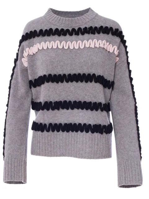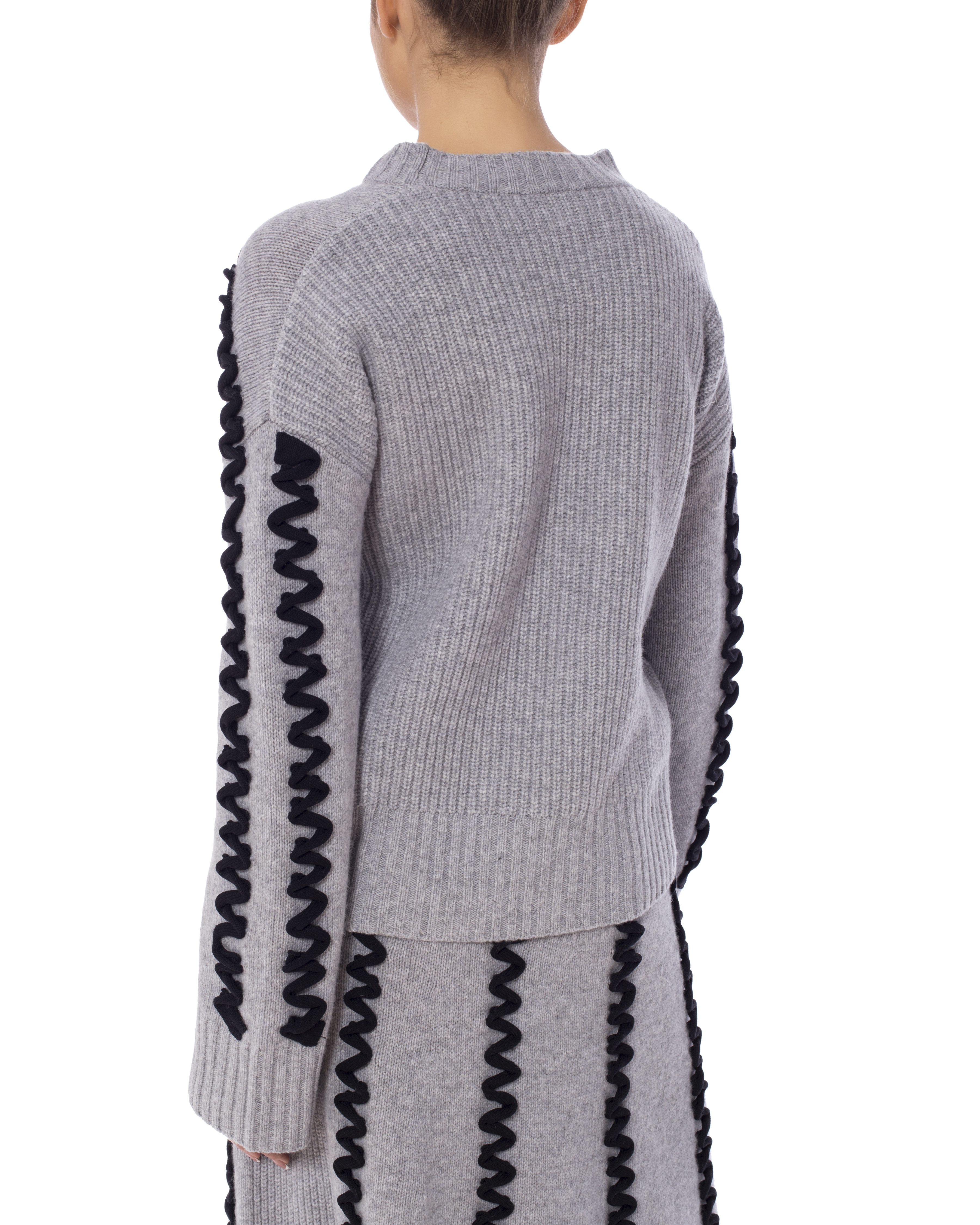 Детали: прямой крой, круглый вырез горловины с широким манжетом, спущенный длинный рукав с манжетами. Аппликация в поперечные зигзаги. Спинка в рубчик.