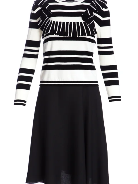 Детали: А-силуэт, верхняя часть имитирует джемпер из джерси в полоску, отрезная линия талии и юбка длиной до колена с глубокими складками.