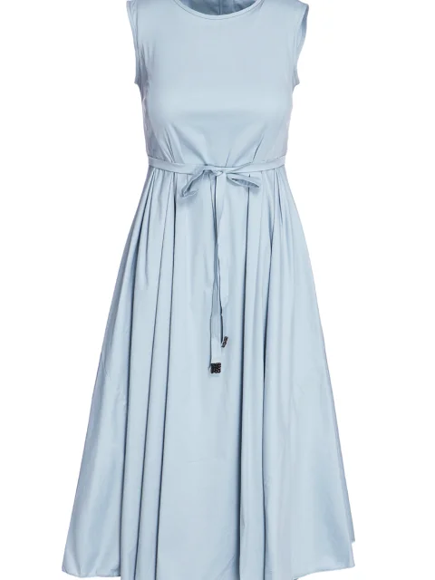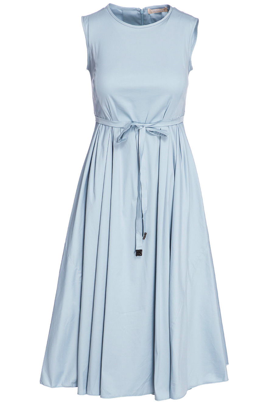Детали: А-силуэт, облегающий крой топа, круглый вырез горловины, отрезная линия талии, юбка с крупными обильными складками, прорезные карманы по боковым швам, длина ниже колена, тонкий пояс по линии талии. Застегивается потайной молнией на спинке.