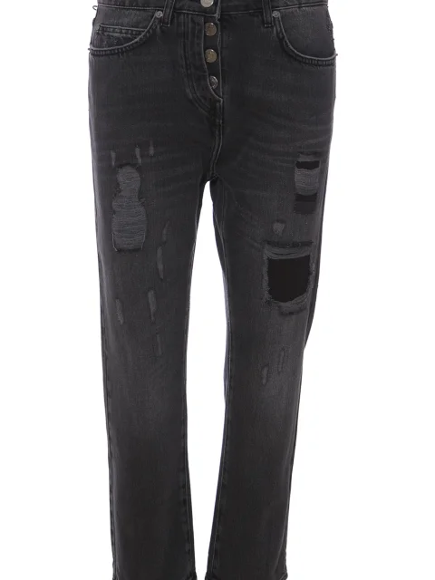 Детали: прямой крой, слегка зауженный книзу, высокая посадка, пять традиционных карманов, длина 7/8, прорехи и заплатки на штанинах, шлевки для ремня, ширинка с рядом пуговиц.