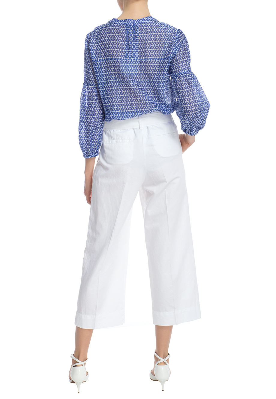 Детали: прямой крой, ворот стойка, втачной рукав со сборкой от локтя и тонкой манжетой, длина 7/8, планка с рядом пуговиц, орнамент.