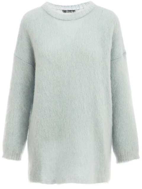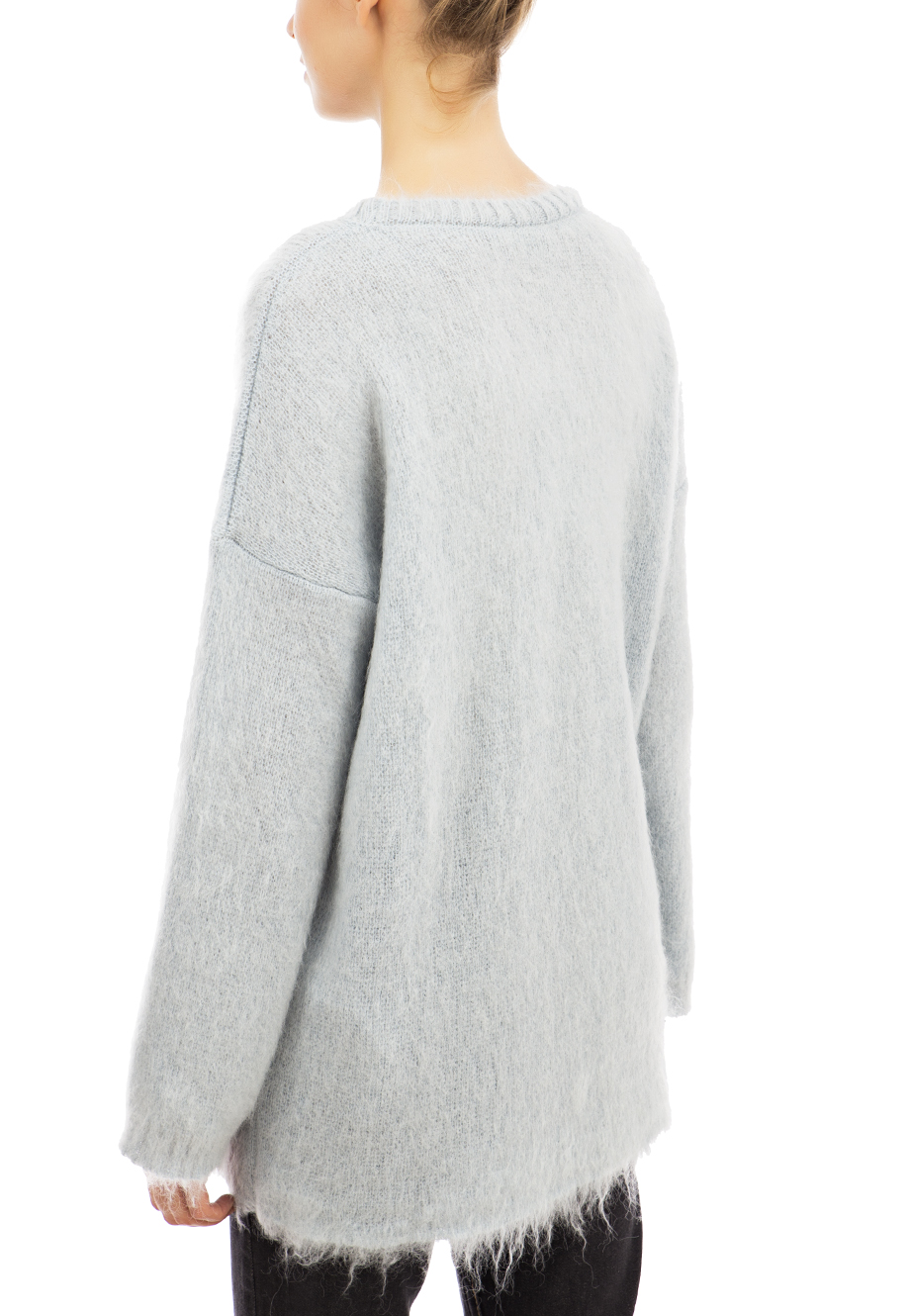 Детали: прямой удлинённый силуэт, круглый вырез горловины, длинный спущенный рукав, гладкая вязка, пушистая фактура пряжи.