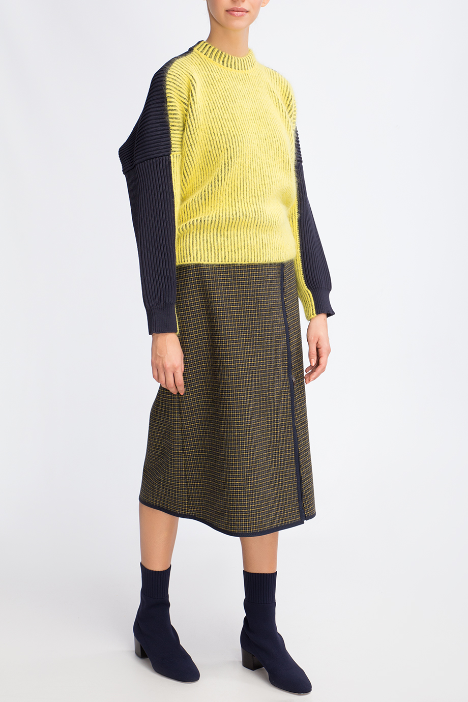 Детали: овальный крой, круглый вырез горловины, спущенный длинный рукав с манжетами, фактурный узор вязки, контрастная полочка и передняя часть рукава.