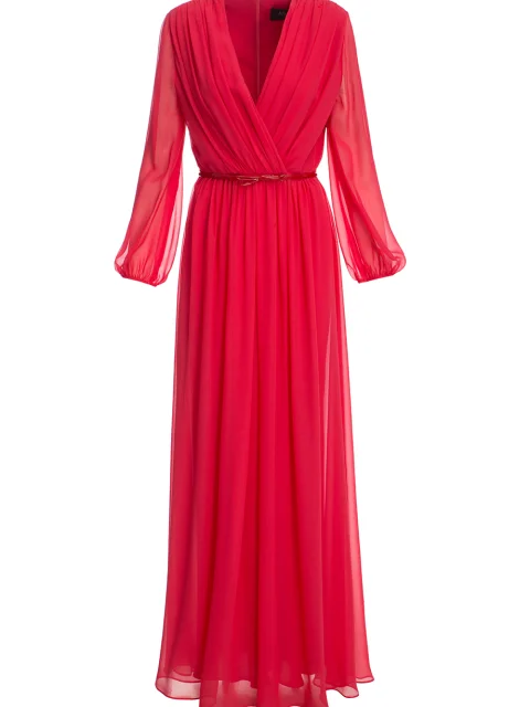 Детали: А-силуэт, декольте на запах с драпировкой, длинный втачной рукав собранный тонкой манжетой, отрезная линия талии, тонкий пояс из лакированной кожи, юбка со сборкой длины макси.