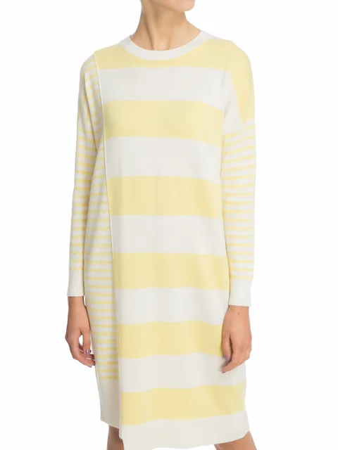 Детали: прямой крой, круглый вырез горловины, спущенный длинный рукав, асимметричная длина и два вида полос.