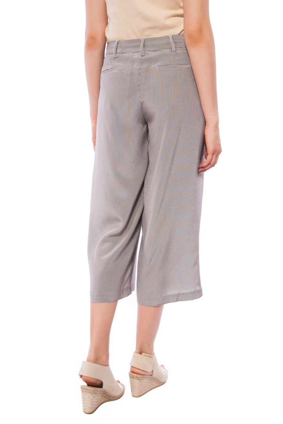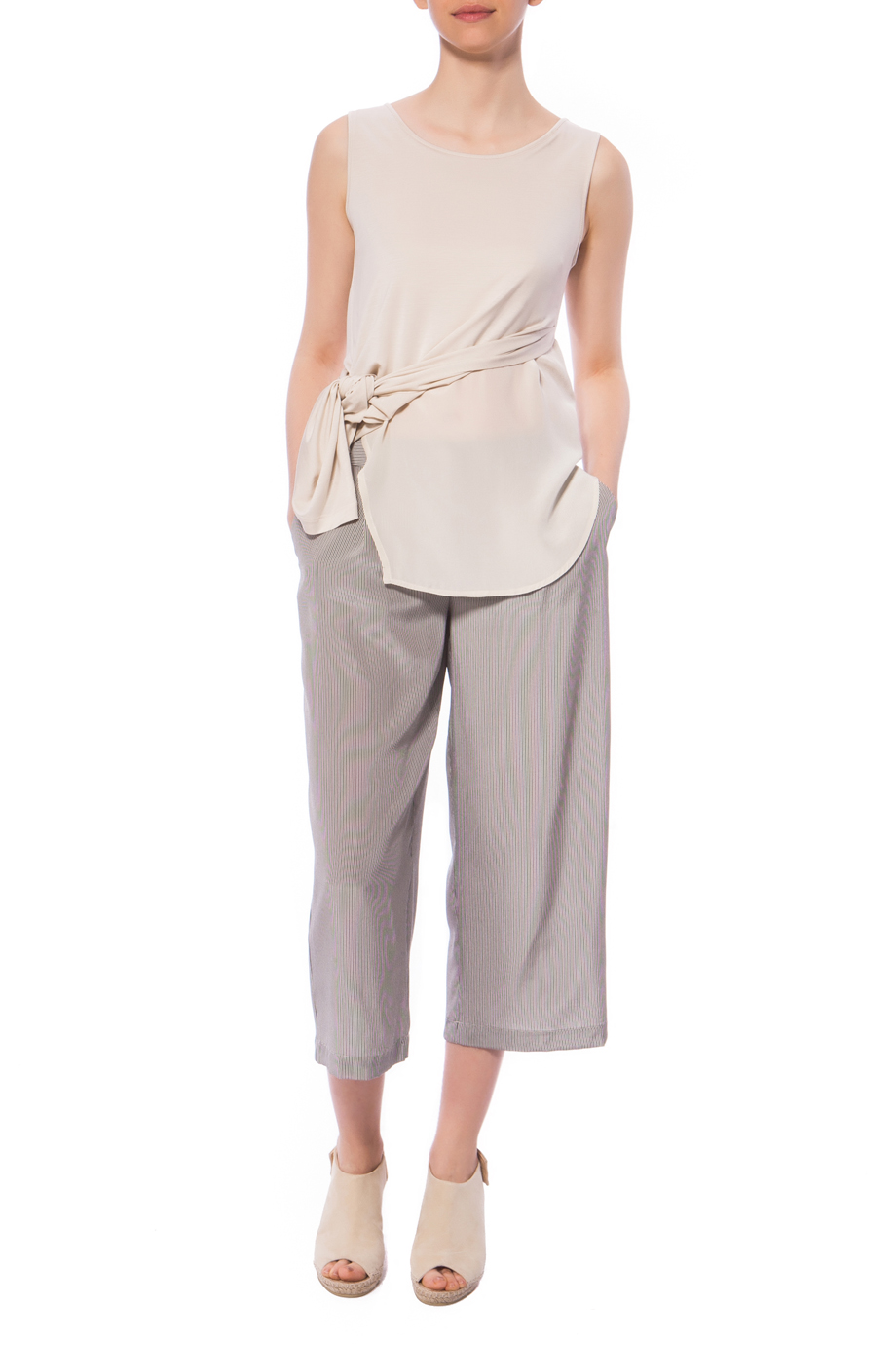 Короткие брюки ниже колен свободного кроя с защипами впереди. Застегиваются на молнию и пуговицу, скрытые клапаном. Впереди два французских боковых кармана и два прорезных сзади. На поясе шлевки для ремня.