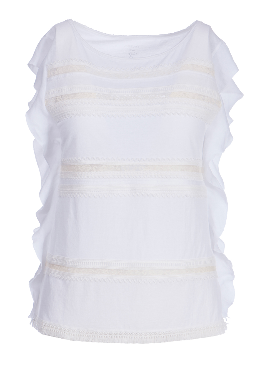 Крой прямой, свободный. Круглый вырез. Короткий рукав-клин переходит в линию воланов по бокам. На груди и спинеполосы из тонкого кружева.