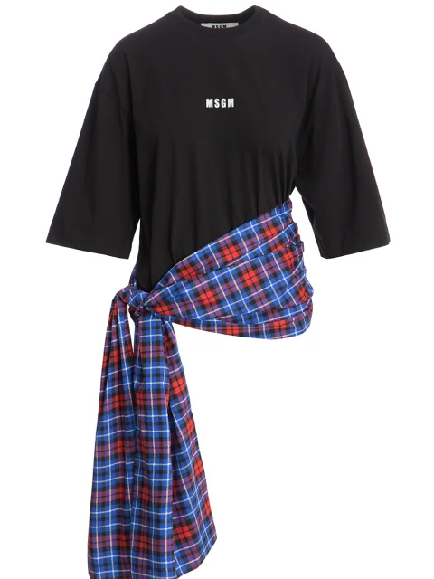 Детали: прямой крой, круглый вырез горловины, короткий втачной рукав, логотип на груди, широкий пояс-кушак в клетку по линии талии.