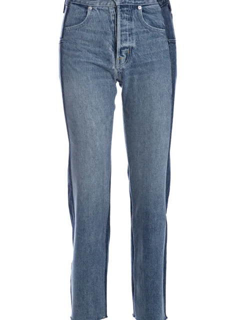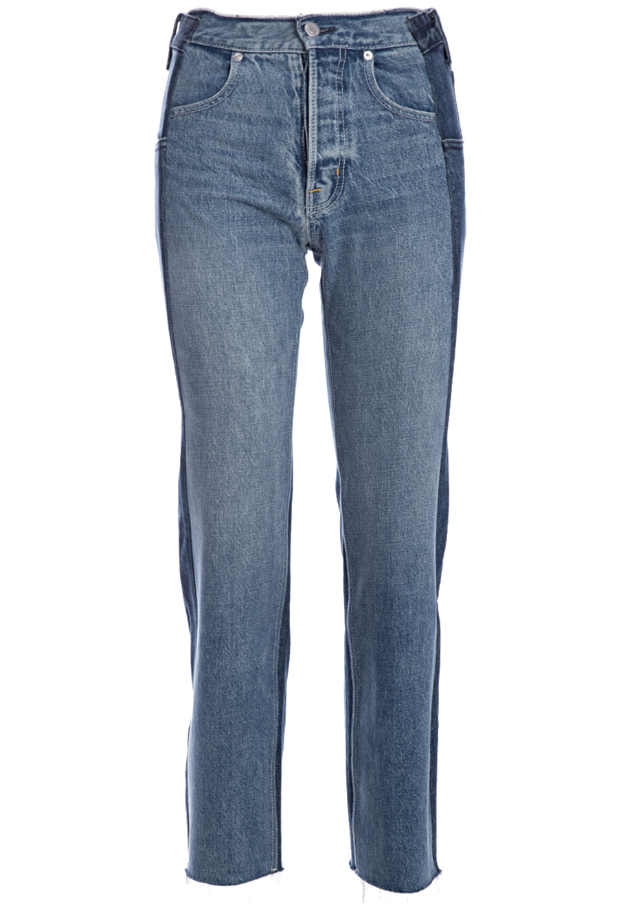 Детали: прямой крой, высокая посадка, четыре традиционных кармана, комбинация денима двух цветов. Необработанный нижний край.