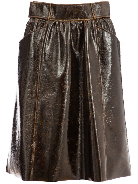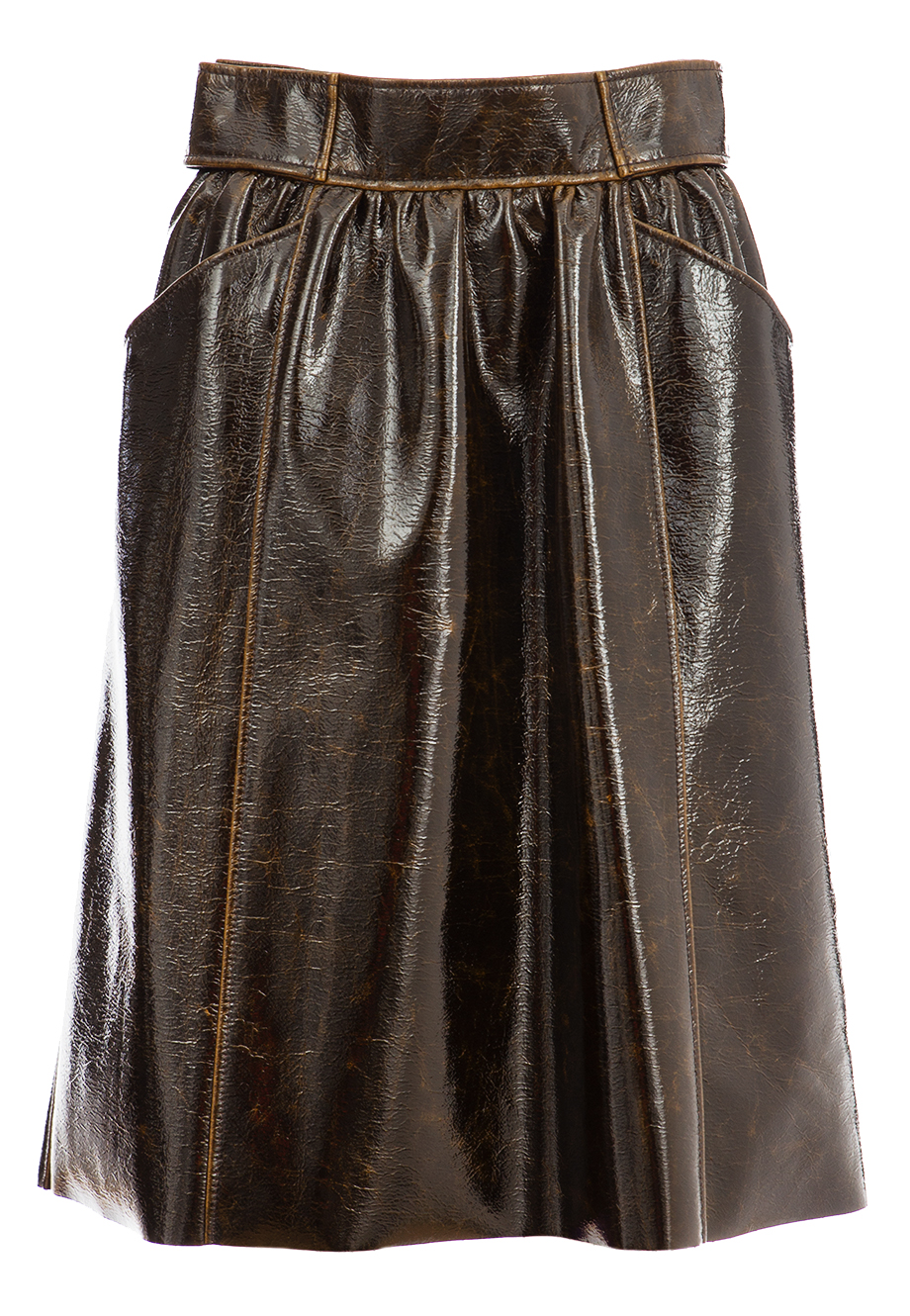 Детали: трапециевидный крой, высокая посадка, гладкая лаковая кожа с эффектом винтажности. Мелкая сборка от пояса, прорезные фигурные карманы, длина выше колена.