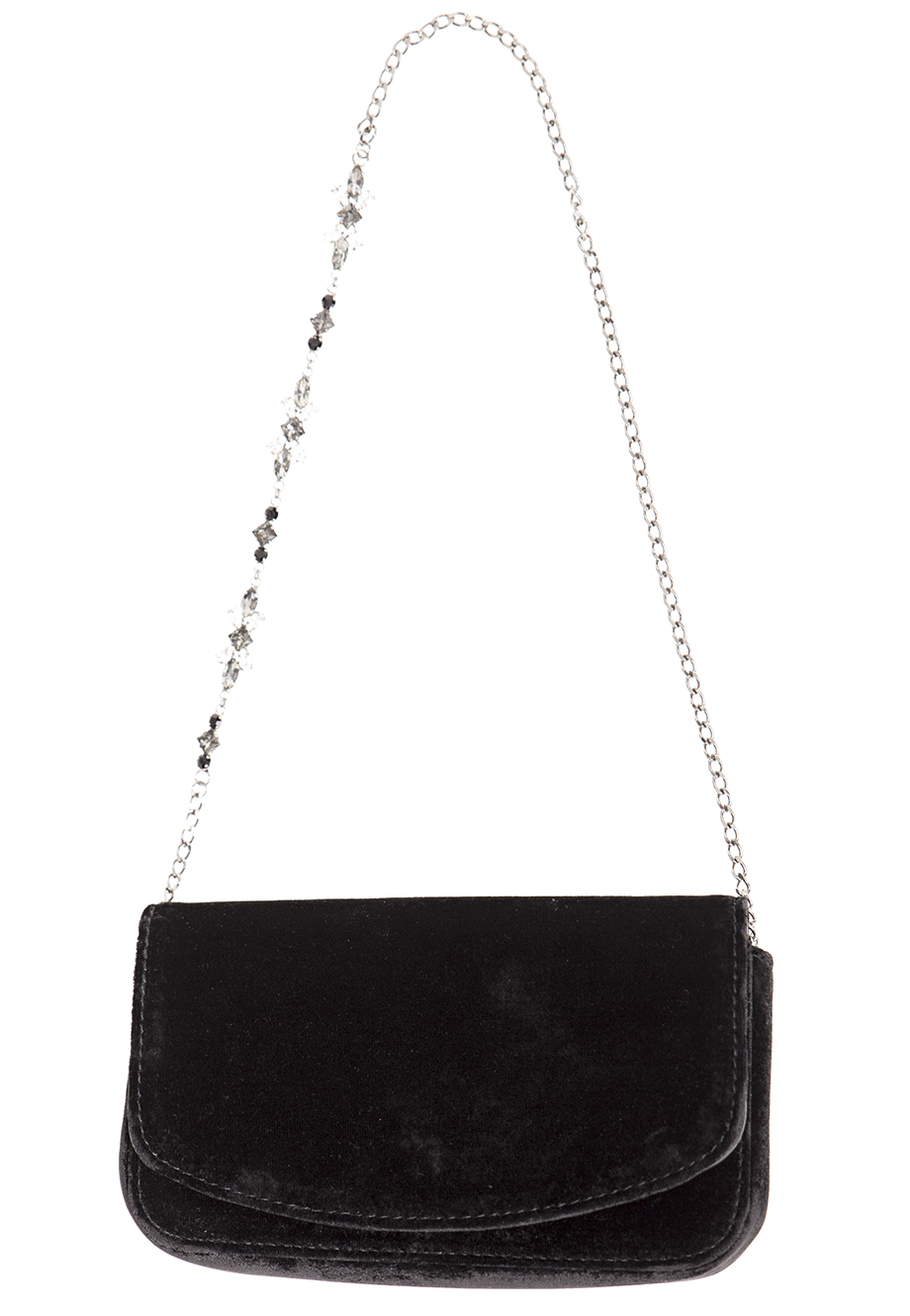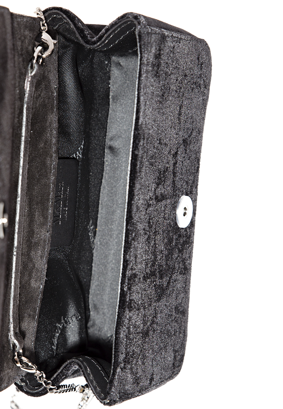Детали: прямоугольная форма, крышка-клапан с магнитной кнопкой, плечевой ремень в виде цепочки с декоративной вставкой из кристаллов.