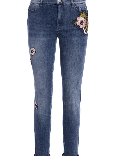 Детали: облегающий крой, средняя посадка, пять карманов, контрастная бежевая строчка, пояс со шлевками для ремня, пуговица, ширинка. Цветочные нашивки.