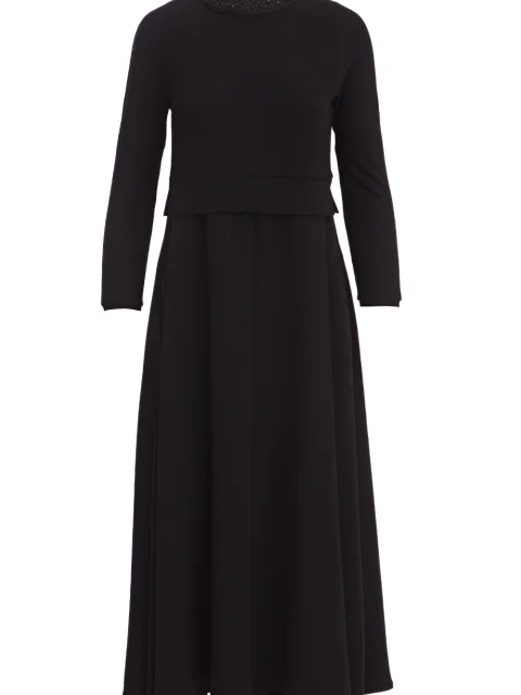Укороченный свитшот с круглым вырезом горловины, втачным рукавом и боковыми разрезами. Съёмный воротник-колье, расшитый бисером. Завязка репсовой лентой.