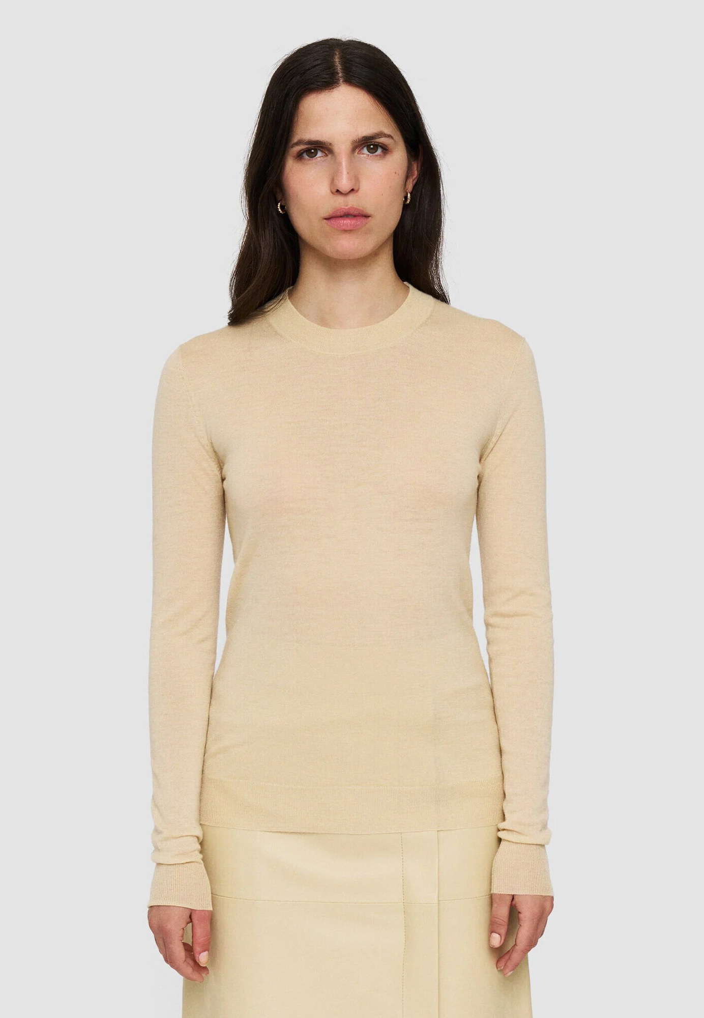 М'який светр з кашеміру. Прямий крій. Круглий виріз. Довгий рукав. Комір, манжети та поділ у рубчик. Напівпрозора тканина. Колір: кремовий. Розмір моделі: S.