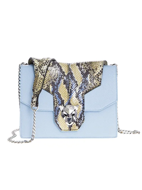 Детали: прямоугольная форма, крышка клапан с фактурной нашивкой из кожи с текстурой, имитирующей рептилию и металлической эмблемой. Застёгивается скрытой магнитной кнопкой, плечевой ремень в виде цепочки с кожаной вставкой, внутреннее отделение с карманом на молнии.