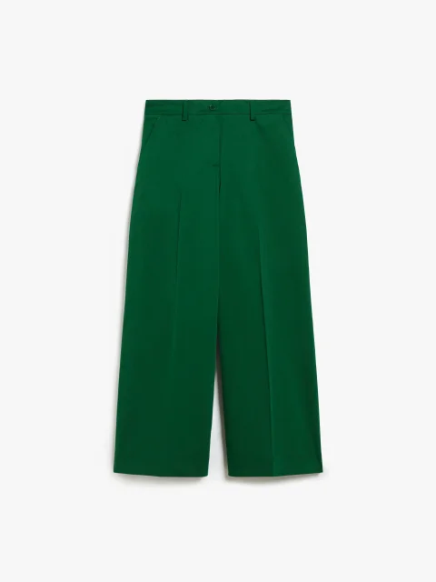 Брюки з еластичної бавовняної атласної тканини Модель прямого крою Вкорочена довжина Скошені бічні кишені Прорізні задні кишені на ґудзиках Гладкі складки Висока талія Зріст моделі: 178 см Талія: 62 см Стегна: 88 см Колір: зелений