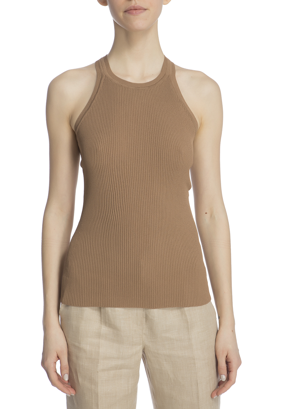Детали: облегающий крой, американская пройма, узор вязки в рубчик.