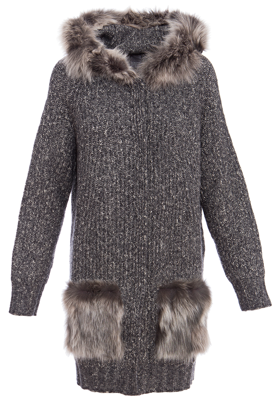 Детали: прямой крой, длинный рукав-реглан, капюшон с меховой опушкой, накальные карманы, декорированные мехом, меланжевая пряжа. Застегивается пришивными скрытыми кнопками.