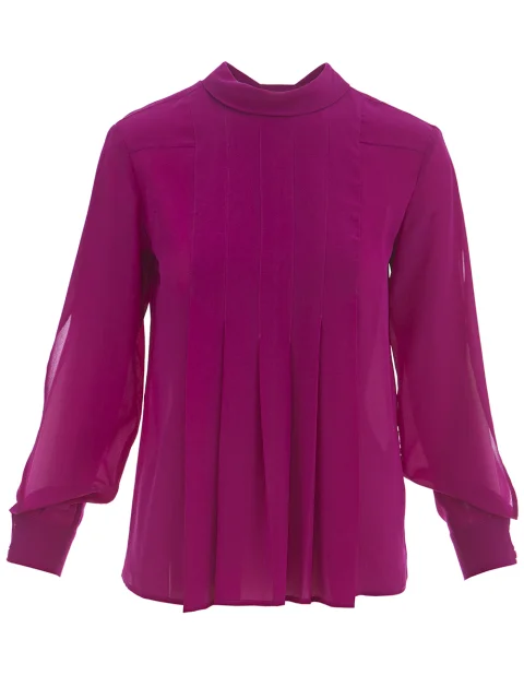 Детали: прямой крой, высокий ворот с отворотом, декоративная плиссировка от груди, длинный втачной рукав, собранный манжетой на двух пуговицах. Вдоль рукава – декоративный разрез. Застегивается потайной пуговицей с вырезом каплей на спинке.