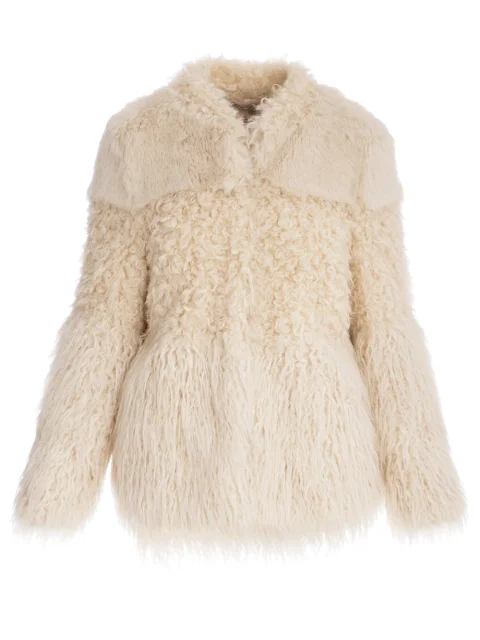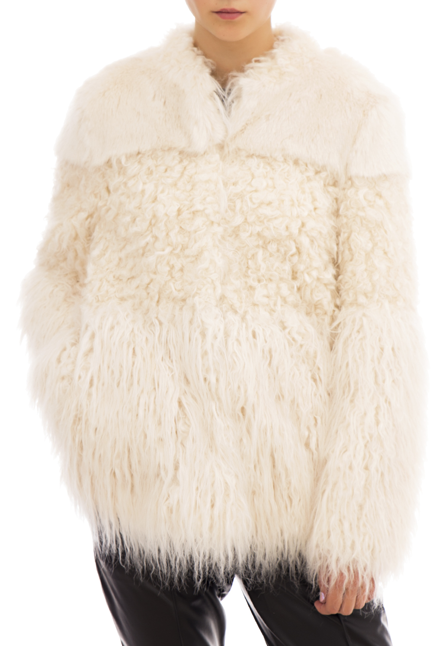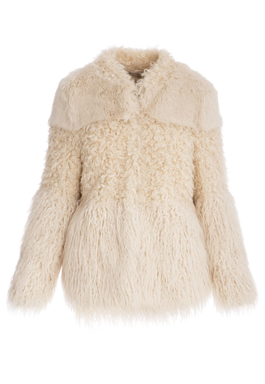 Детали: прямой крой, круглый вырез горловины, длинный втачной рукав, комбинация трех фактур меха, прорезные карманы по бокам, застегивается потайными крючками.