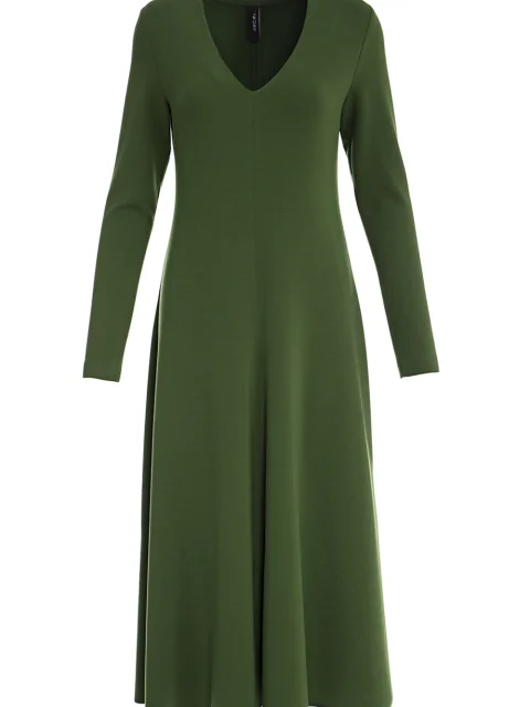 Детали: А-силуэт, V-образная форма декольте, длинный втачной рукав, юбка с глубокими складками.