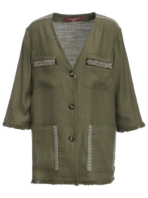 Детали: прямой крой, V-образный вырез, накладные карманы на груди и по бокам, втачные рукава длиной ¾, бахрома по кромке, тесьма на карманах. Застёгивается рядом пуговиц.