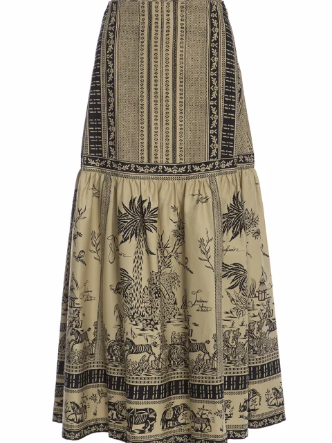 Детали: А-силуэт, высокая посадка, два яруса, монохромный этнический рисунок и орнамент.