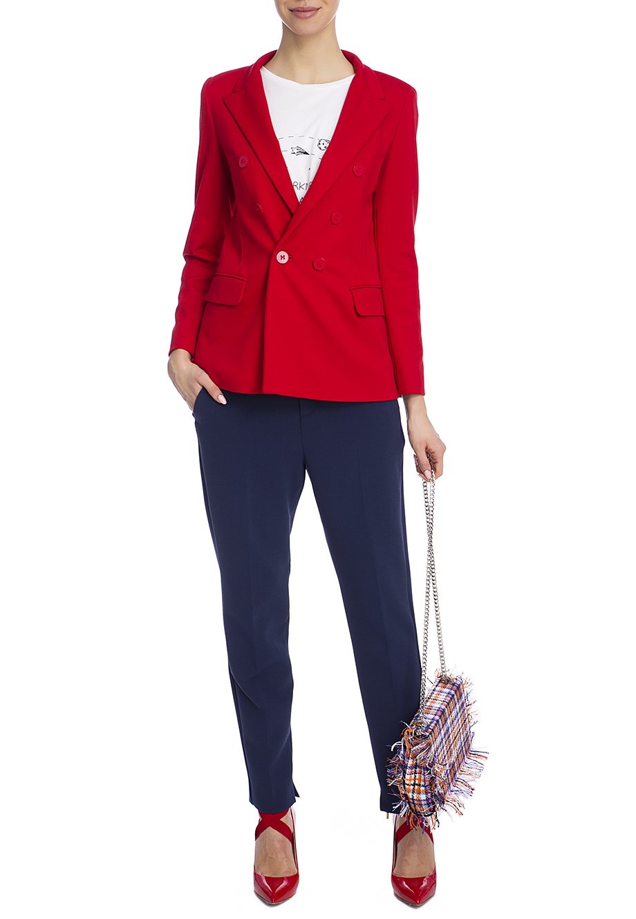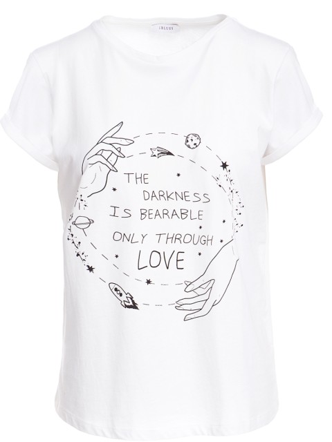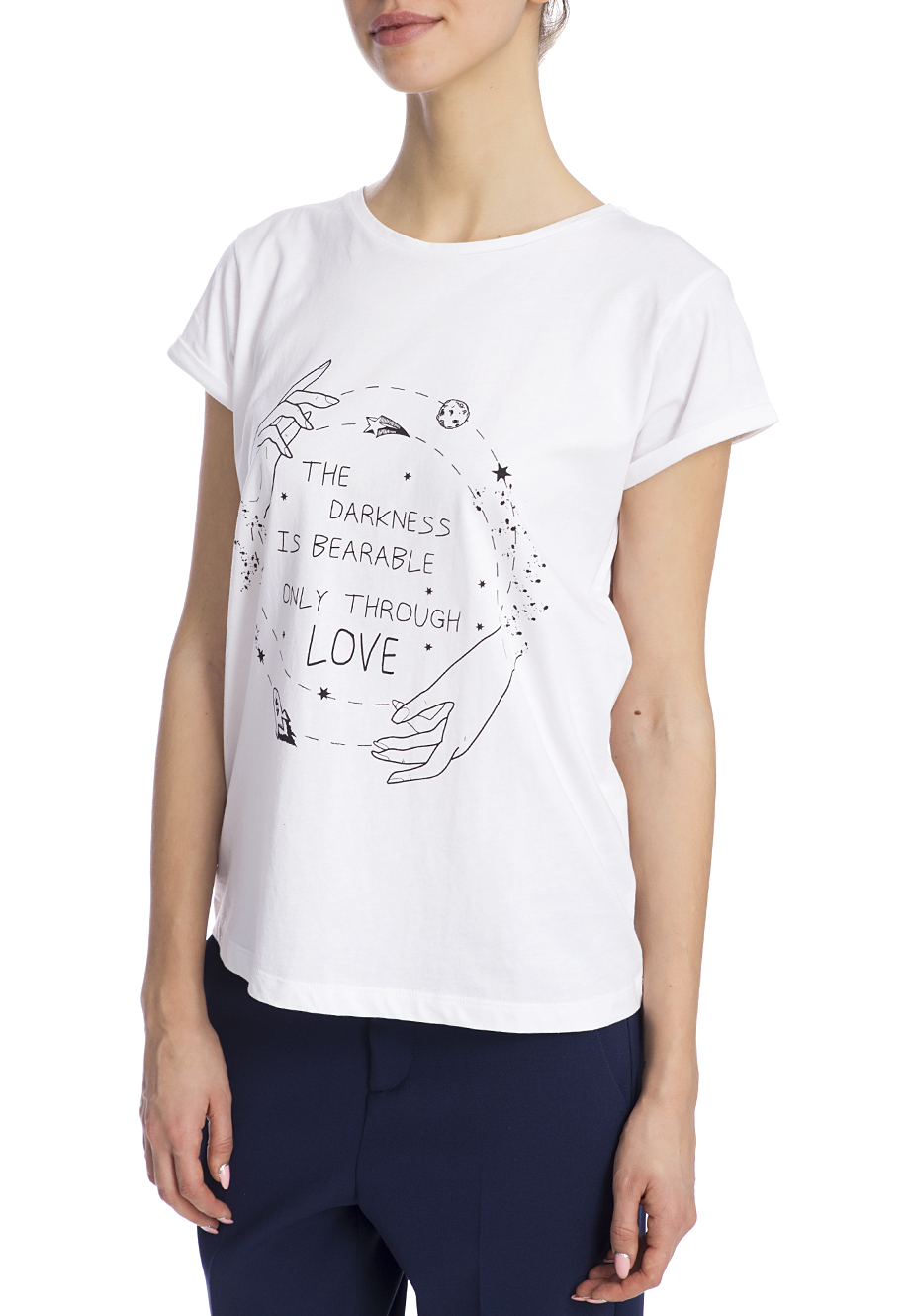Детали: прямой крой, круглый вырез горловины, короткий втачной рукав, на груди монохромный печатный принт.