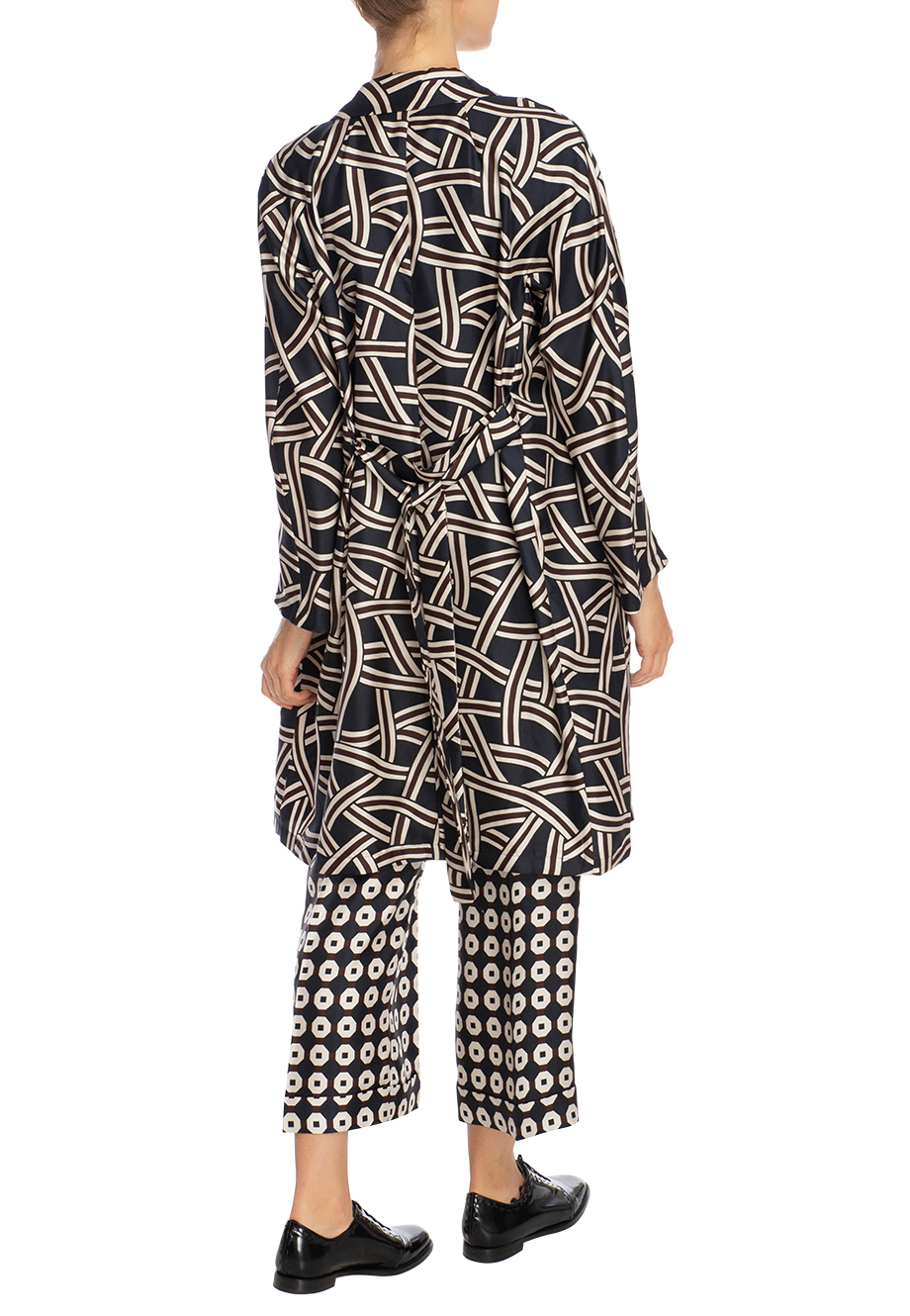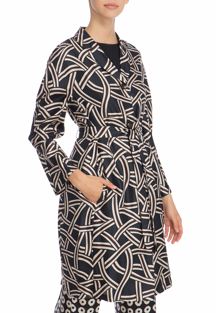 Детали: прямой крой под пояс, отложной воротник с лацканами, цельнокроеный рукав, прорезные карманы по боковым швам, пояс по линии талии, абстрактный принт.
