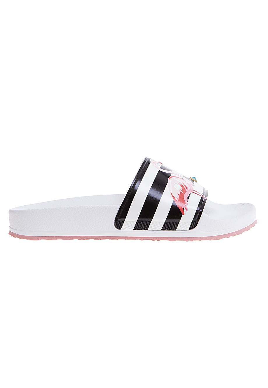 Детали: плоская двуслойная подошва, анатомическая конструкция, широкая перепонка в полоску, декорирована клепками-звездами и фламинго.