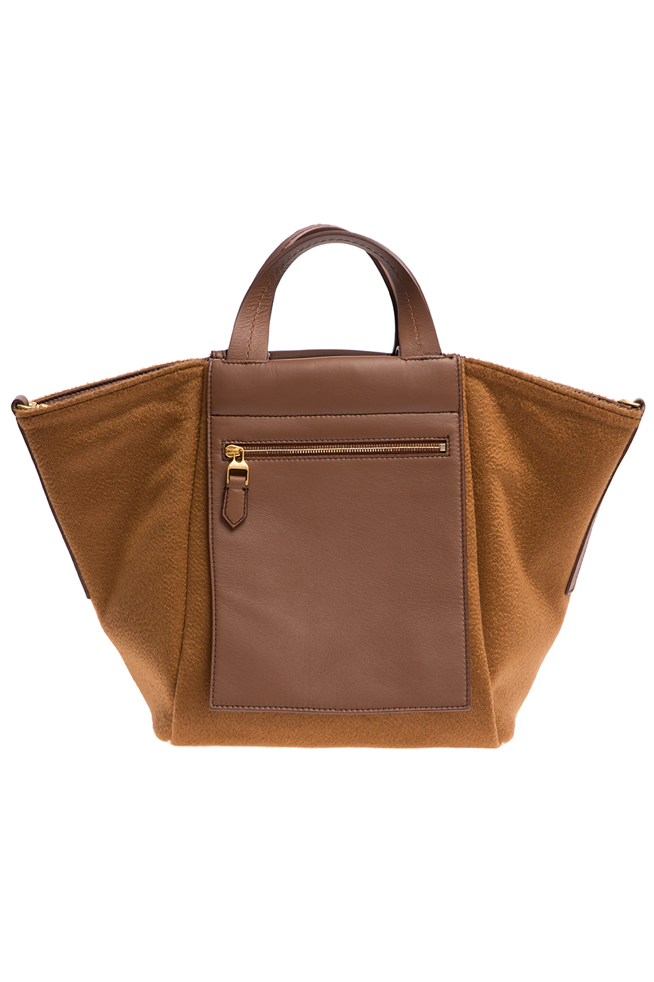 Детали: трапециевидная форма, четыре кожаные ручки разной длины, съёмный плечевой ремень, кожаный карман на молнии. Вторая сторона из гладкой кожи.