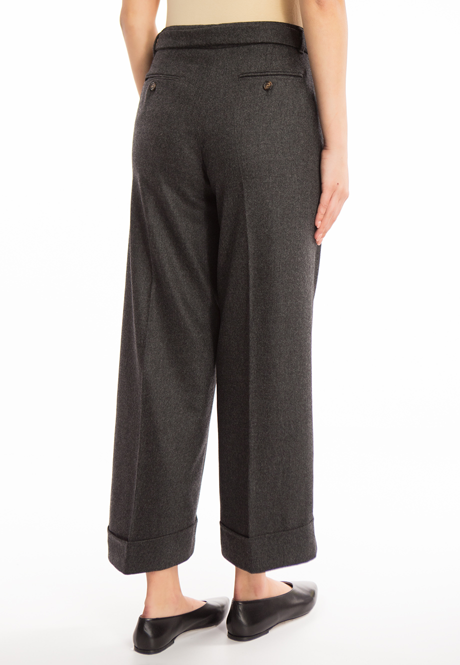 Детали: прямой свободный от бедра крой, высокая посадка, французские боковые карманы, сзади два прорезных с рантом и пуговицей, стрелки вдоль штанин, отвороты по нижнему краю.