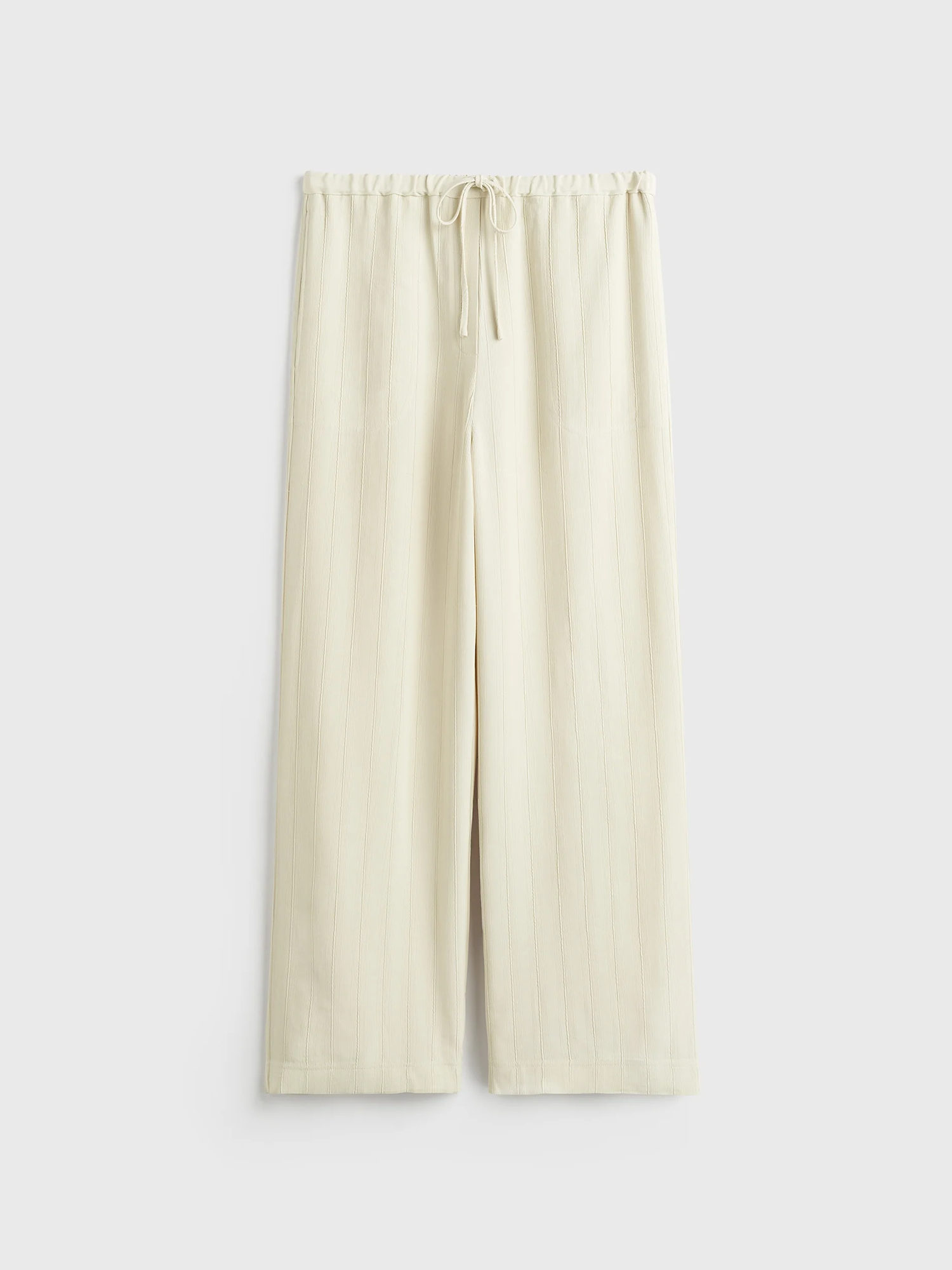 Брюки з суміші віскози та льону Вільний крій Еластична талія на шнурку Рельєфні вертикальні смужки Бічні та задні кишені Колір: екрю Зріст моделі: 180 см Розмір моделі: 36