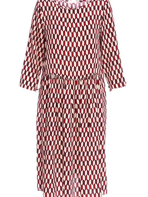 Детали: А-силуэт, круглый вырез горловины, втачной рукав длиной7/8, спущенная линия талии, юбка с мелкой сборкой, геометрический принт.