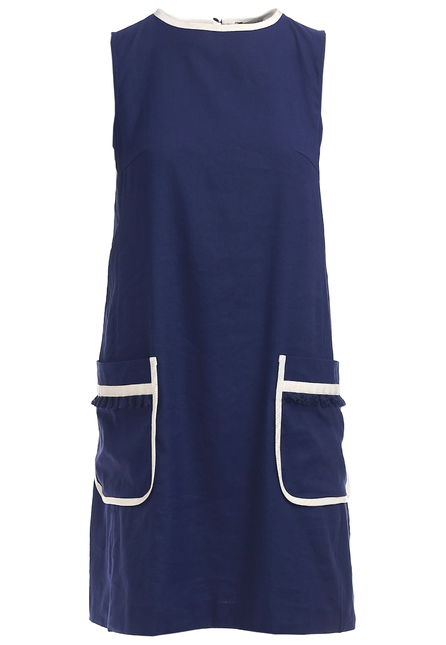 Детали: А-силуэт, круглый вырез горловины, без рукавов, накладные карманы, на спинке перевёрнутая складка, контрастные кромки по боковым швам, вороту и на карманах.