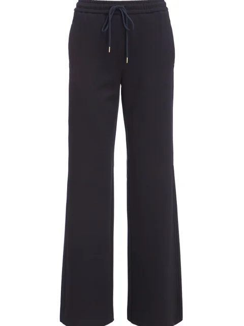 Детали: прямой свободный от бедра крой, средняя посадка, пояс на кулиске со шнурком и резинкой, прорезные карманы по боковым швам, тонкие лампасы по боковому шву.