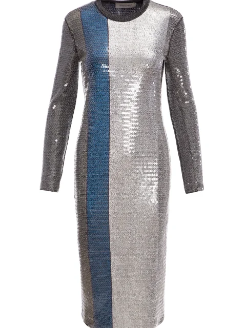 Детали: приталенный крой, круглый вырез горловины, длинный втачной рукав, рисунок цветными полосами из пайеток.