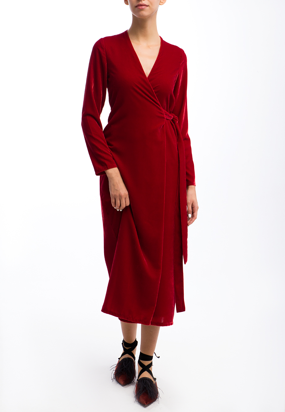 Детали: крой на запах, длинный втачной рукав, завязки по линии талии, длина миди.