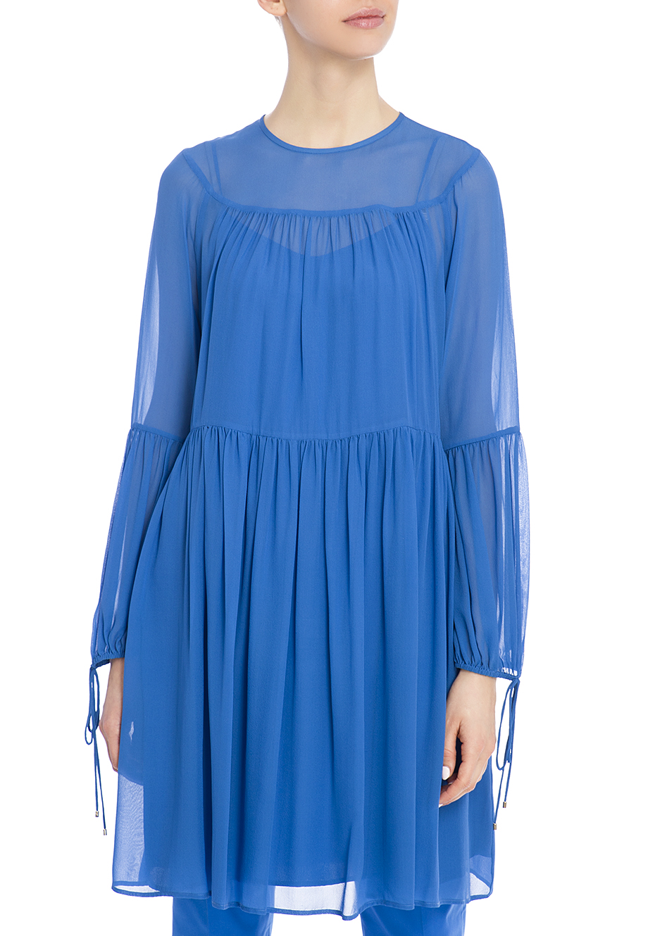 Детали: А-силуэт с многоярусным кроем, круглый вырез горловины, длинный рукав-реглан, собранный затяжной манжетой с завязками, два яруса со сборками, длина до колена, нижнее платье-комбинация. Застёгивается пуговицей с вырезом-каплей на спинке.